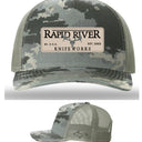 Richardson 112 trucker hat with adjustable snapback, leather Rapid River Knifeworks patch and embroidered outline of the U.P. on the side. Digital Camo/Light Green in color.